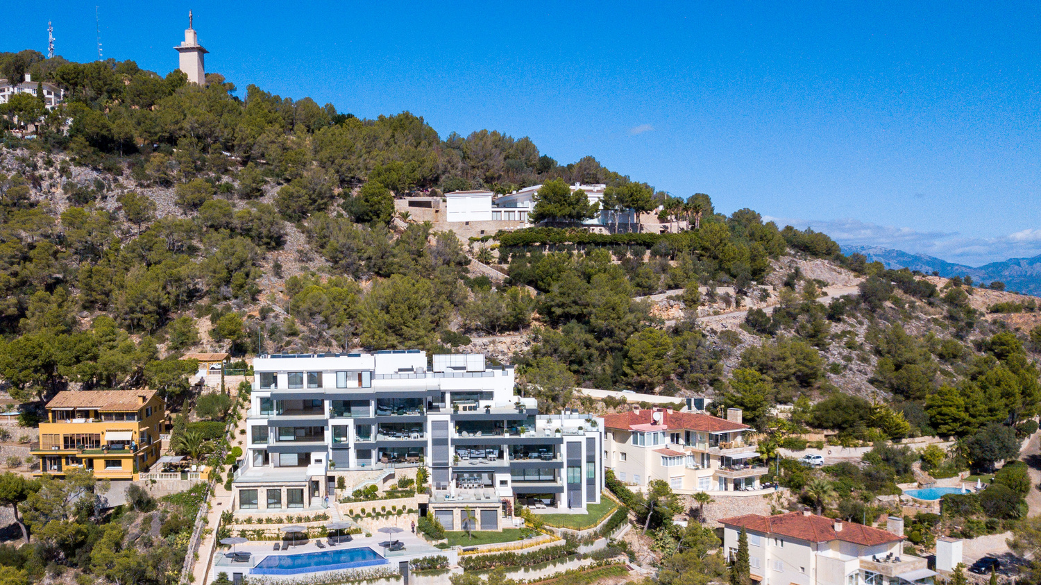 The ground floors have a small private garden. The prices start at 2,5 Million and the living surfaces range from 147 m2 plus 30 m2 of covered terrace to 208 m2 plus 34 m2 of covered terrace and 228 m2 of open terraces. All apartments have included two parking lots in the garage and a storage room. Each block has its own lift. The development has a fully furnished and decorated pilot apartment, which of course demonstrates very well the high-quality materials and the panoramic sea views.