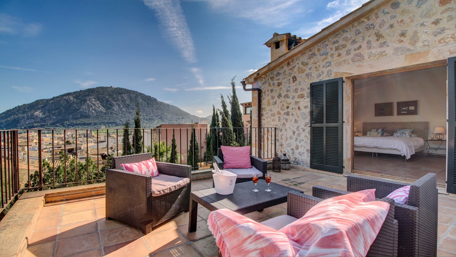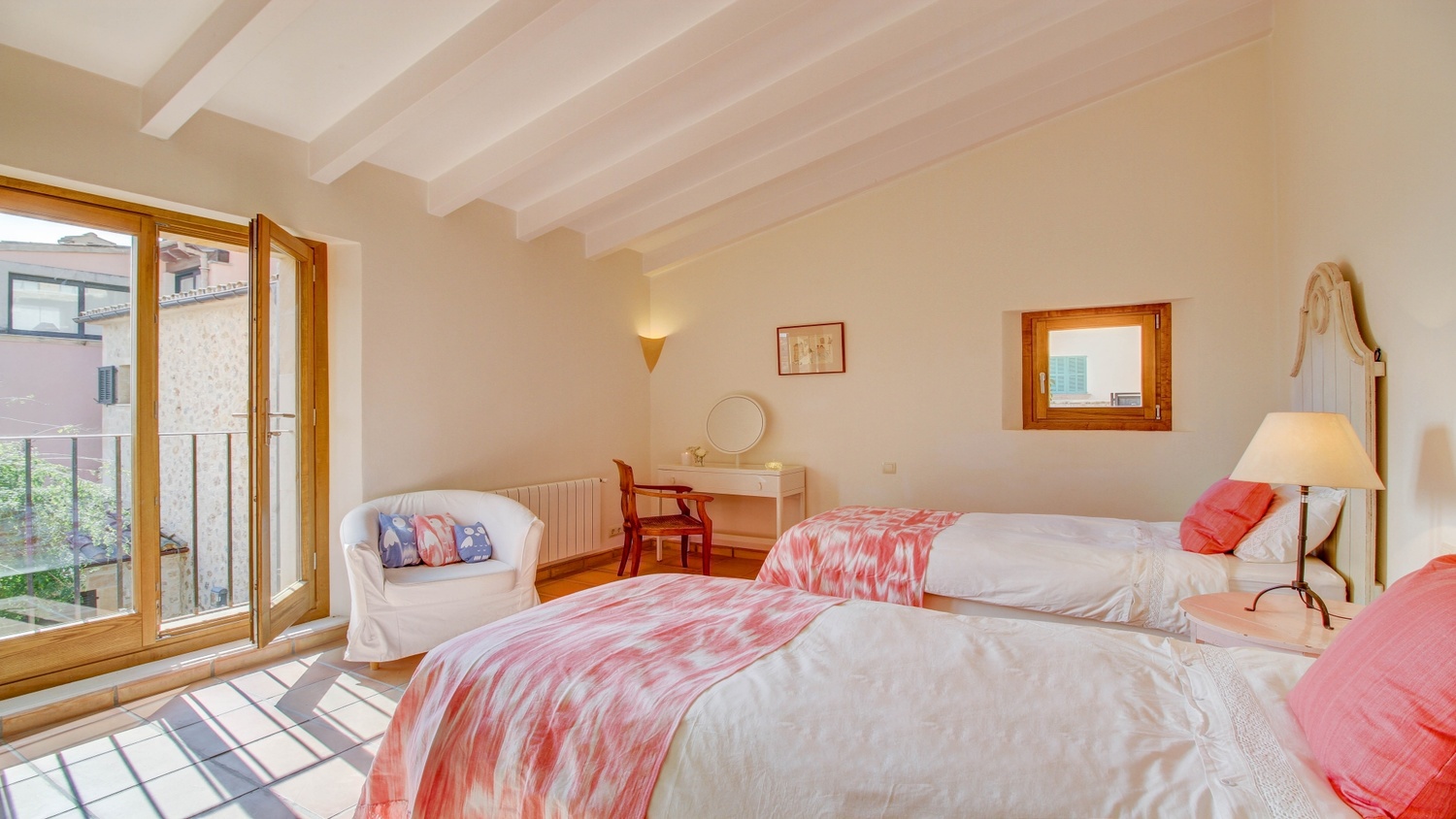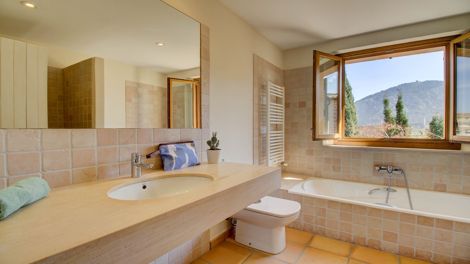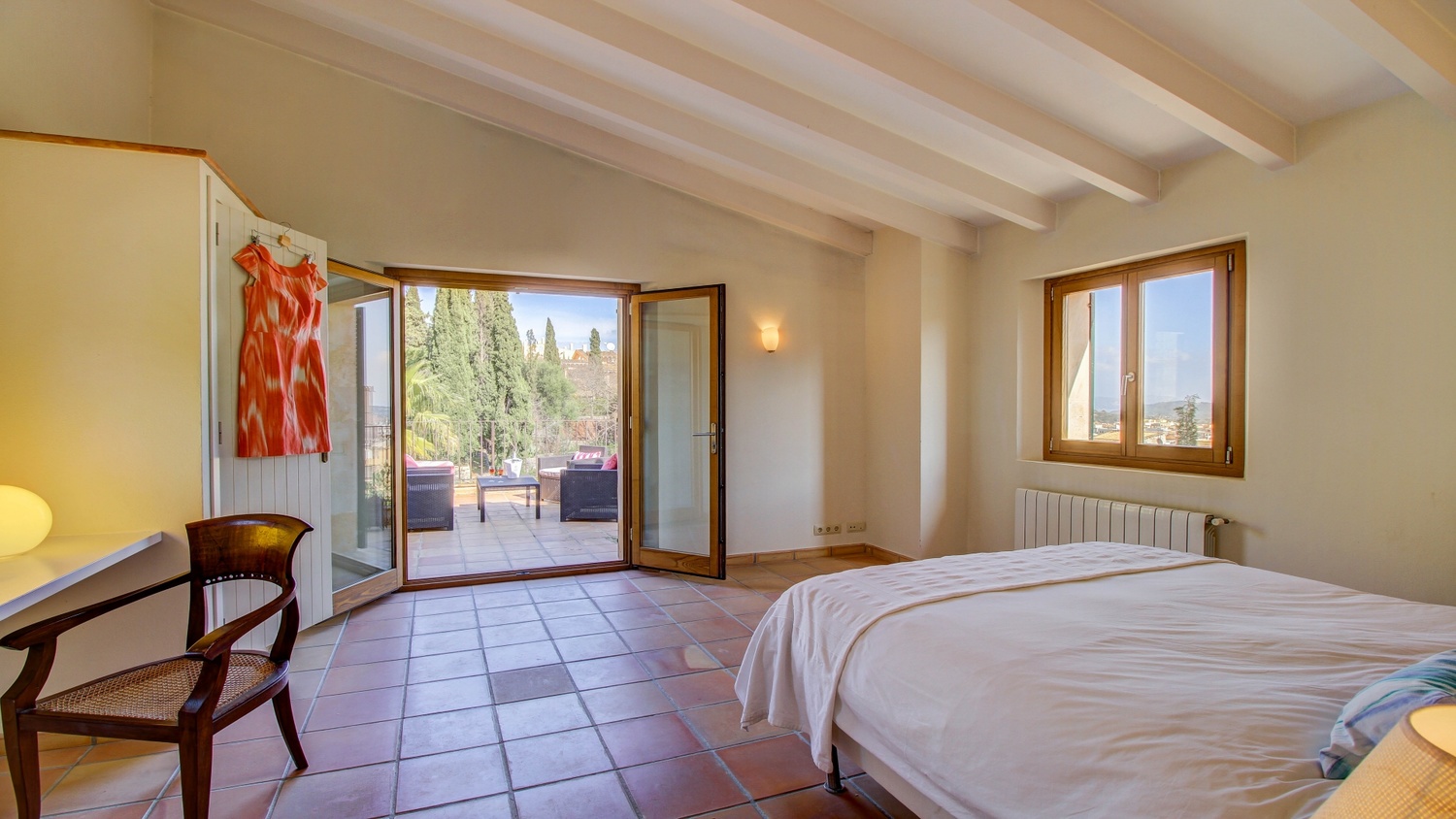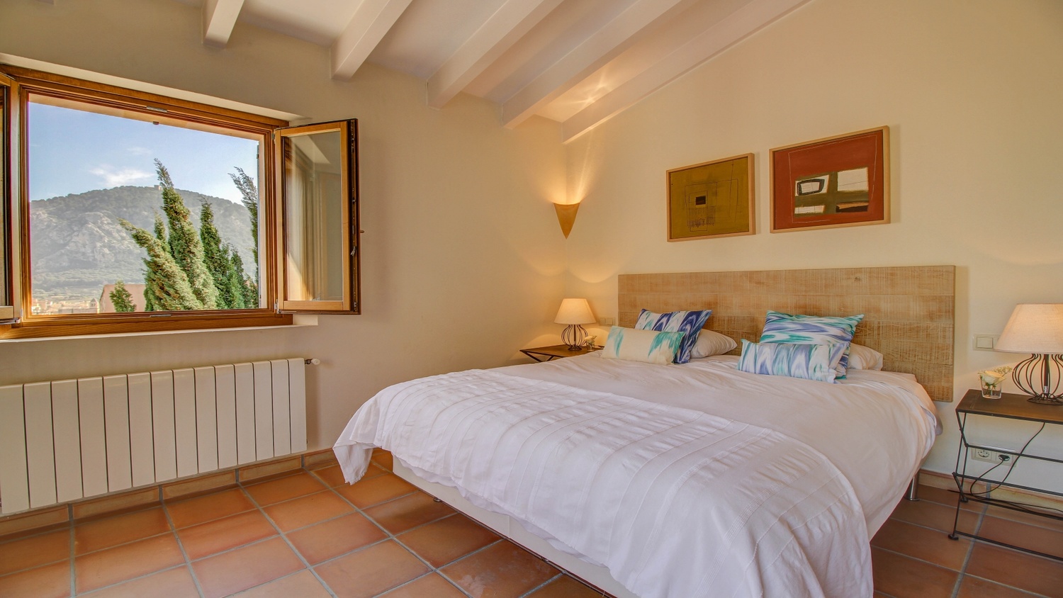 Master bedroom with en-suite bathroom (bathtub and walk-in shower) with access to a large terrace with simply breathtaking views over the historic town of Pollensa, the emblematic Puig de Maria Mountain and the Mediterranean Sea. Good sized twin bedroom with en-suite shower room.