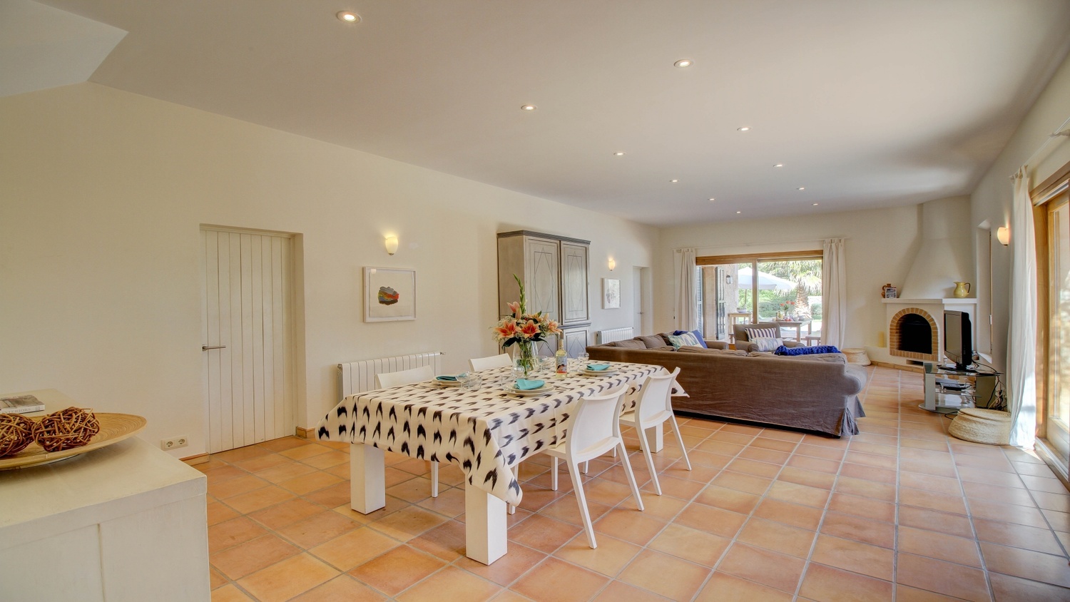 Large sitting/dining room that opens both onto the covered terrace near the pool and the front open terrace underneath the bougainvillea that provides shade during the hot summer days and wonderful to look at when fully blossomed. Separate fully equipped kitchen with larder and patio doors leading to the covered terrace by the pool. The ground floor also offers a large twin bedroom and en-suite bathroom (bathtub and walk-in shower) with access to the front terrace. Air-conditioning in the bedroom. Entrance hall with guest toilet.