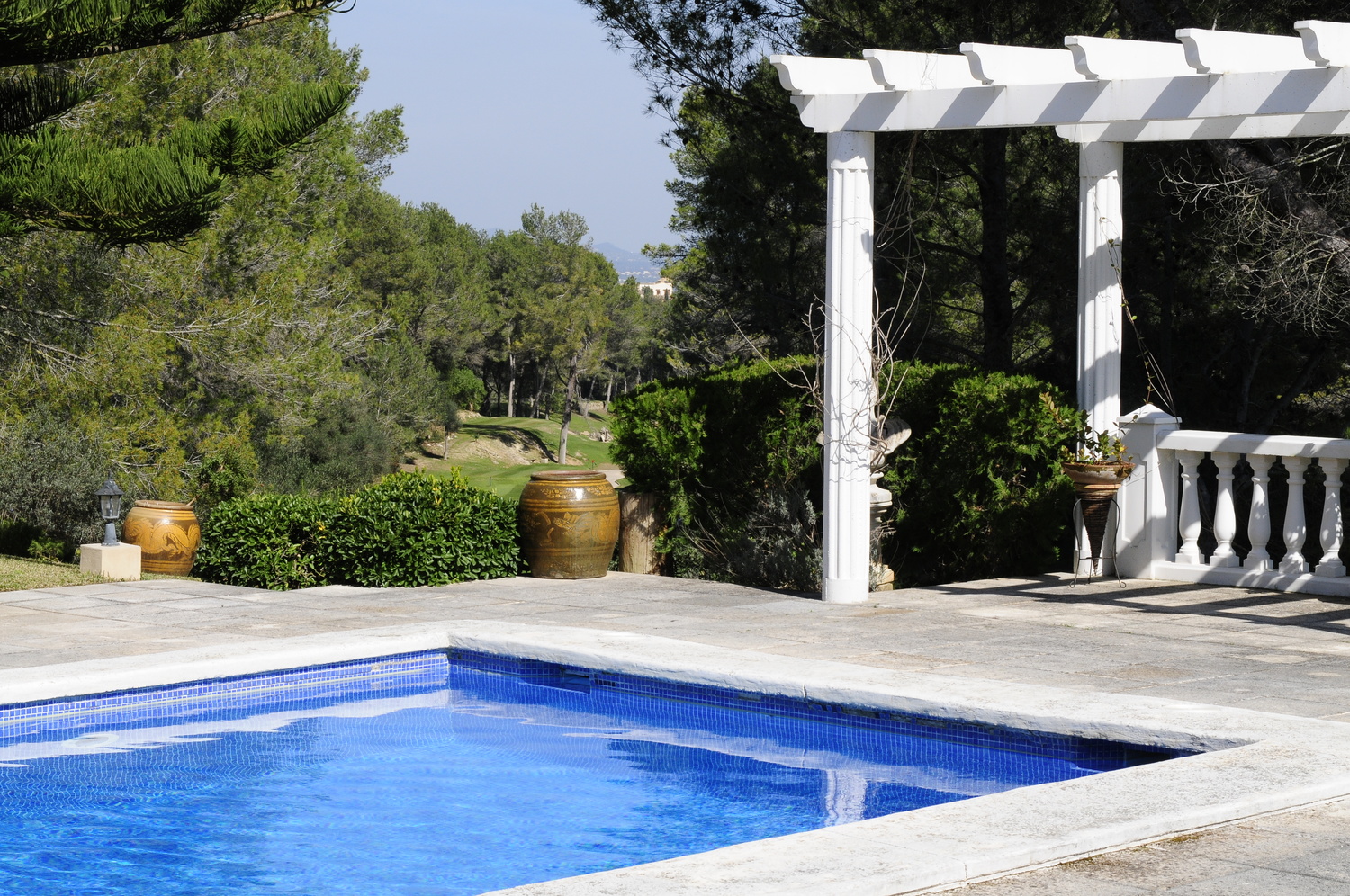 A very pretty and open garden facing directly over the golf course, covered terraces and open balconies, a large 10x4m swimming pool and pool bathroom, covered garden pergolas, a bbq area, large integral double garage, store room.