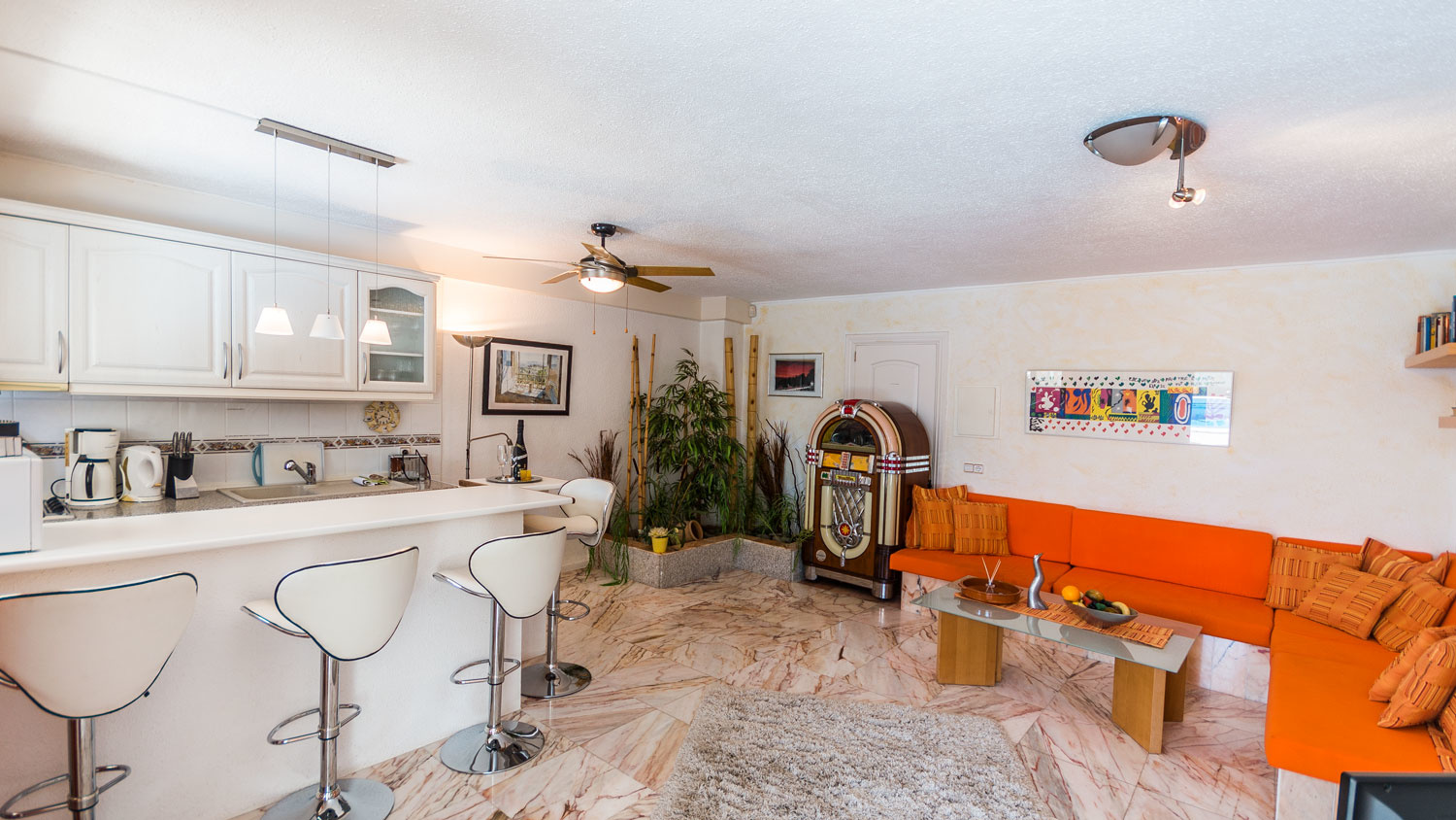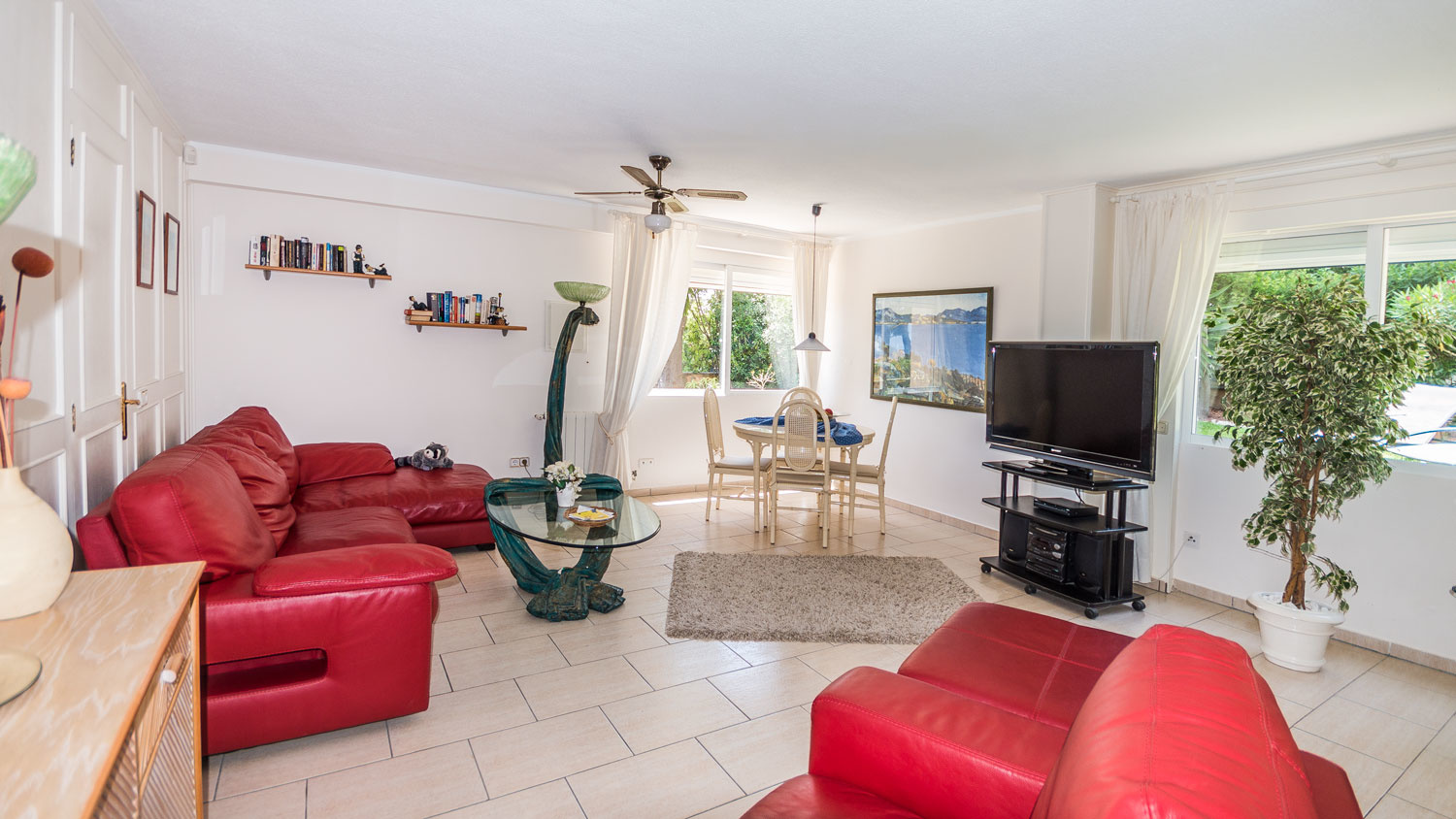 The main apartment has a spacious living area, the highlight of which is the adjoining terrace with its fantastic sea view. There are also two bedrooms with bathrooms.