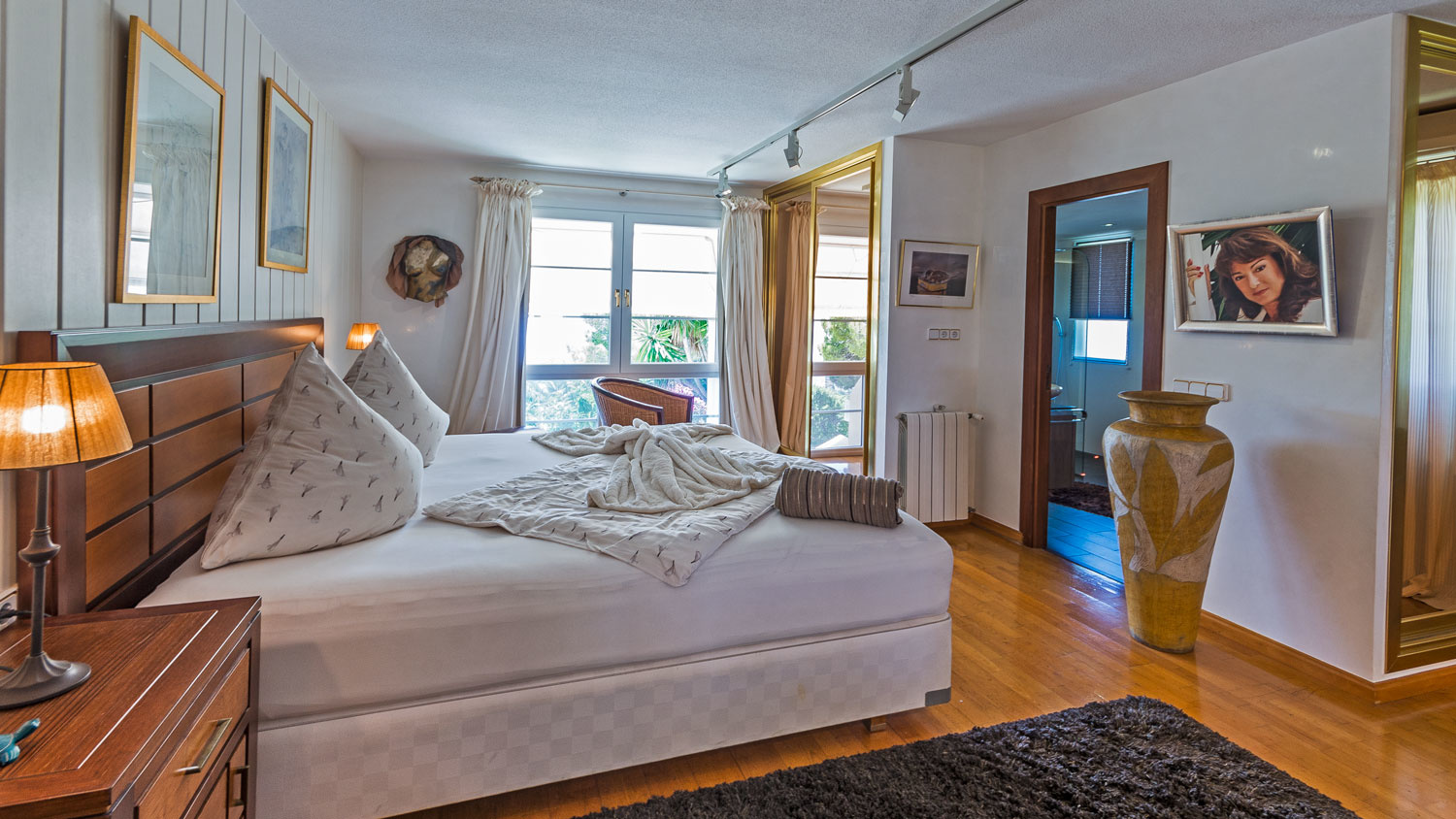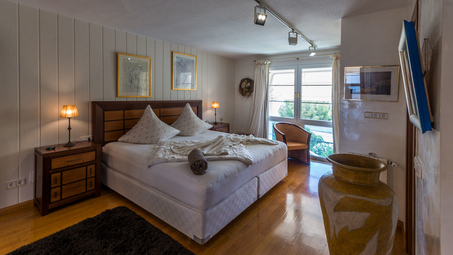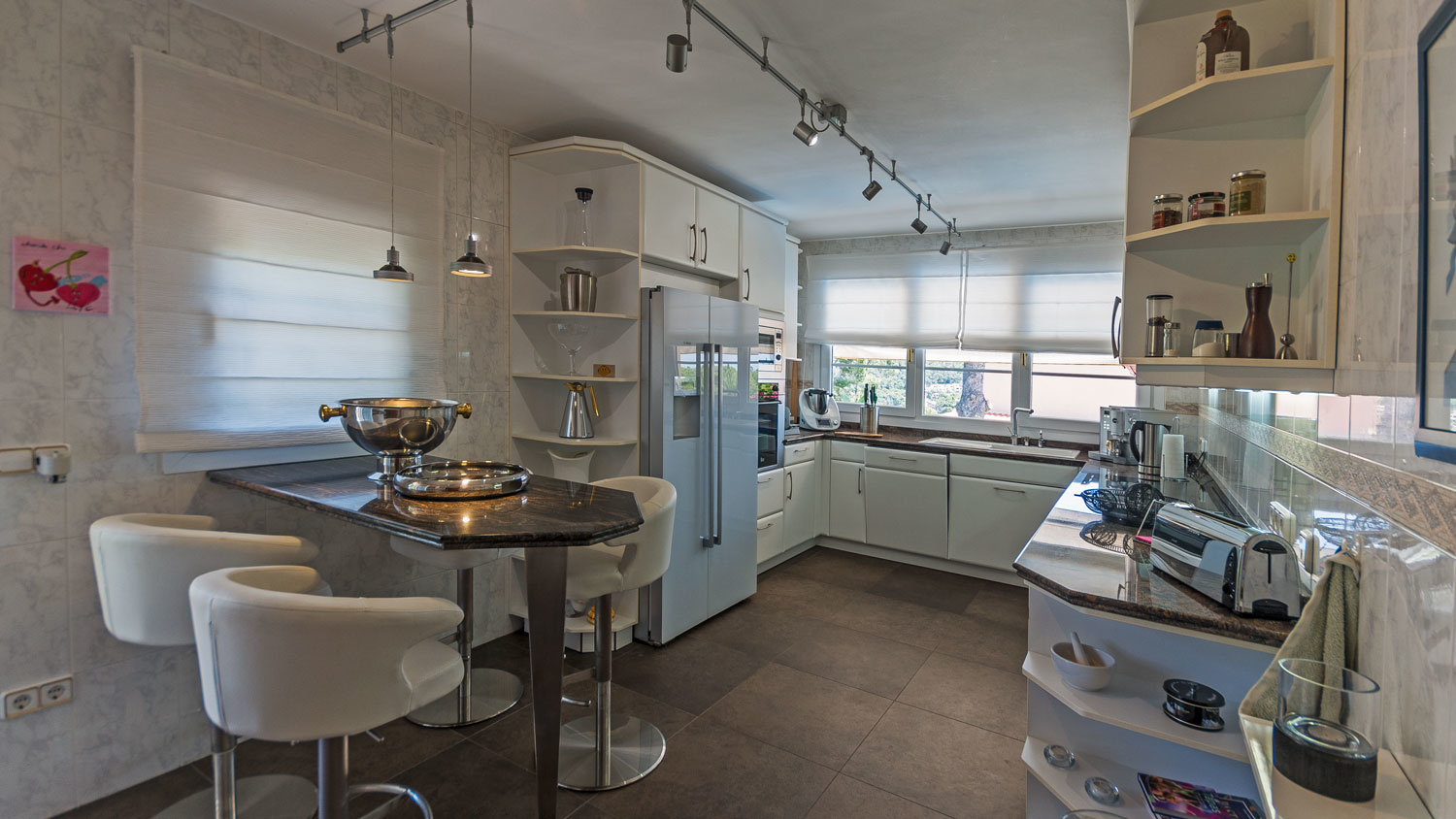 It is characterized by two separate apartments, which can be used both for guests or staff as well as for your grown up children. One apartment consists of one bedroom and bathroom, the other has two bedrooms and a bathroom. Both have their own kitchen, so one can really retreat.