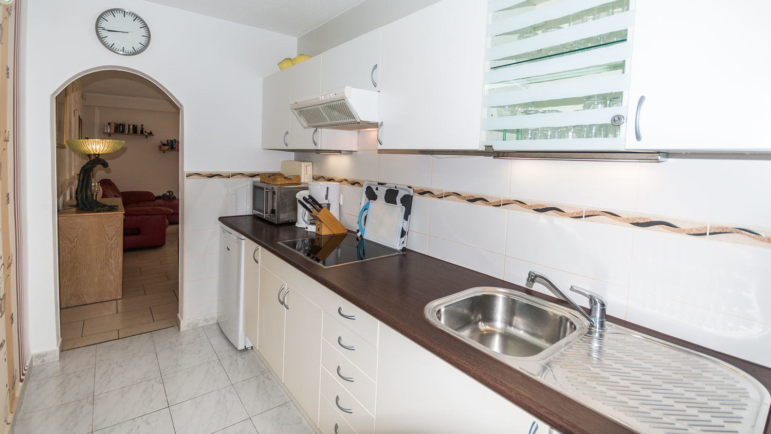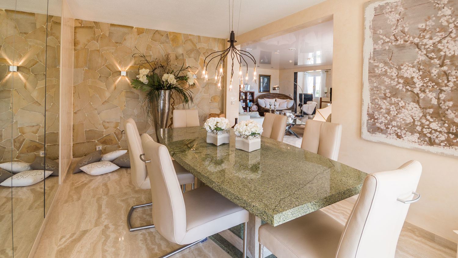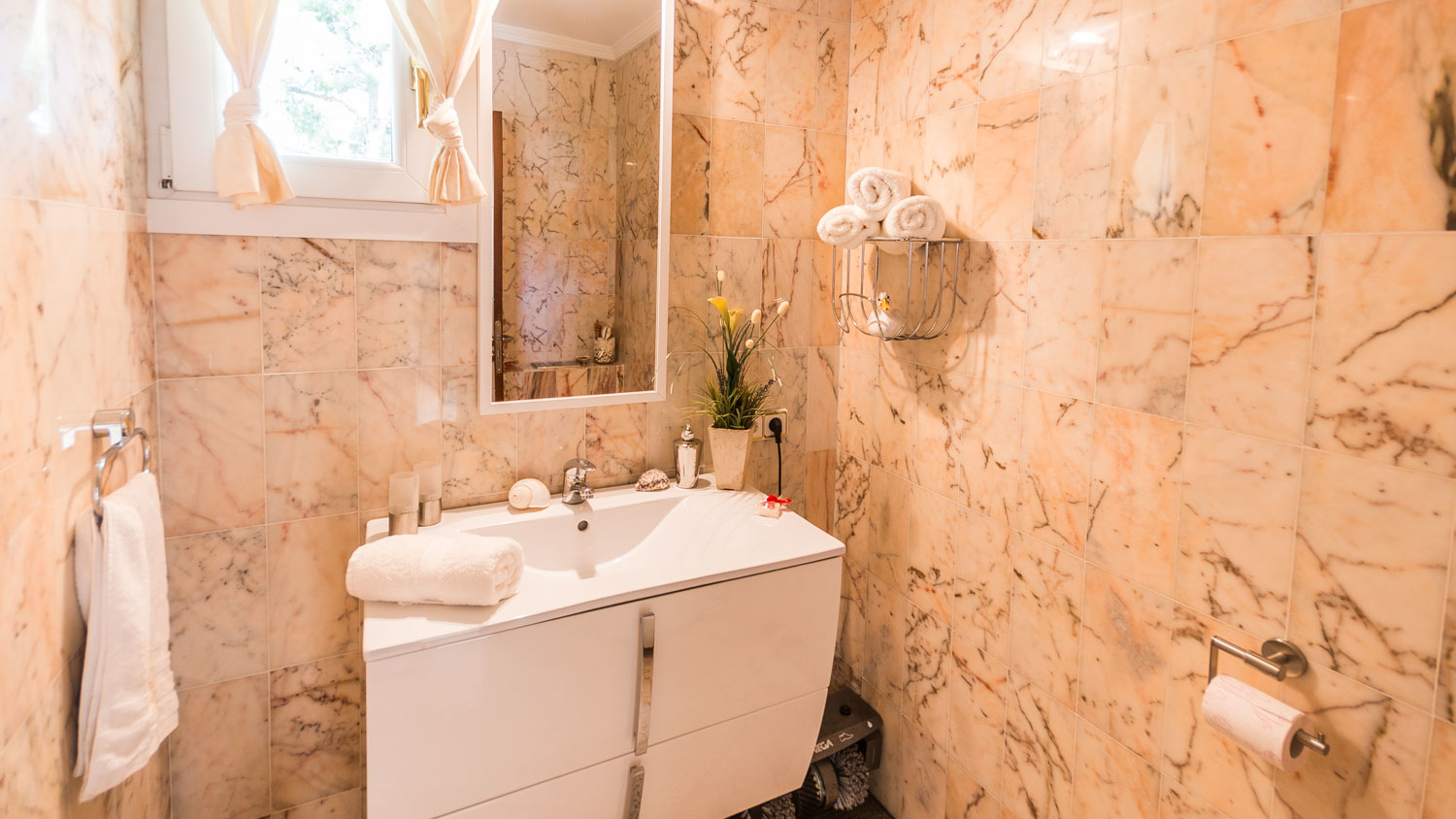 It is characterized by two separate apartments, which can be used both for guests or staff as well as for your grown up children. One apartment consists of one bedroom and bathroom, the other has two bedrooms and a bathroom. Both have their own kitchen, so one can really retreat.