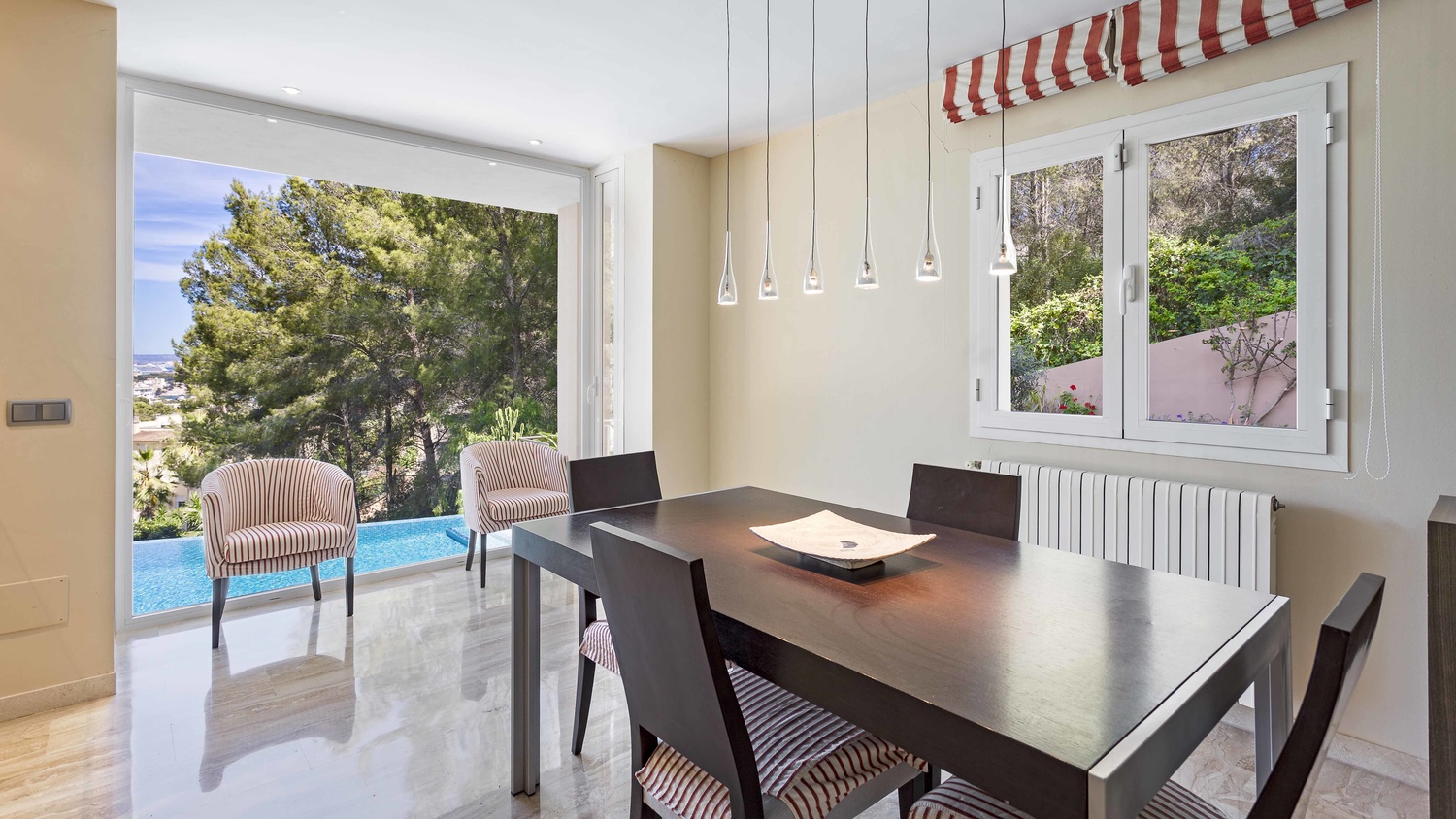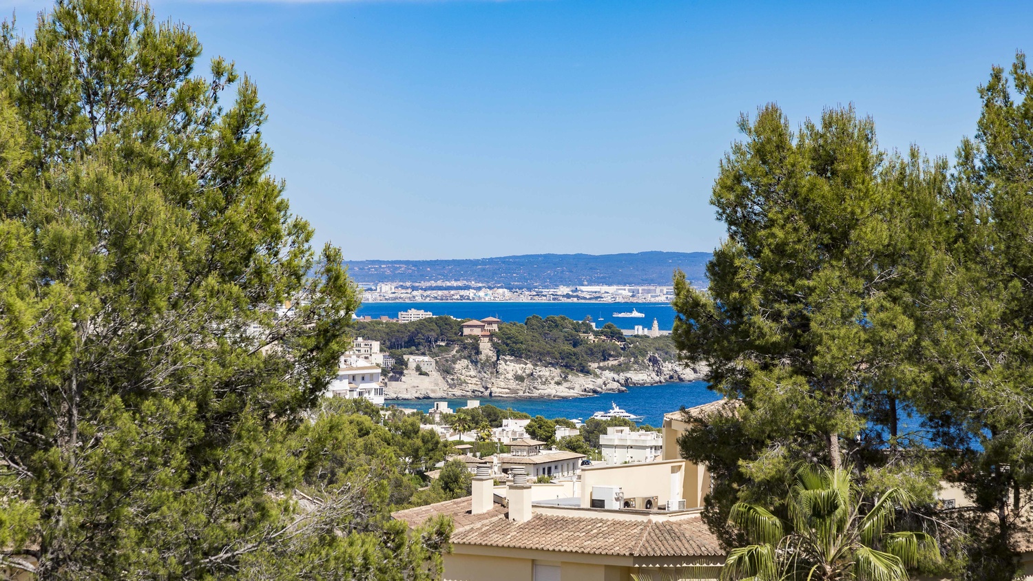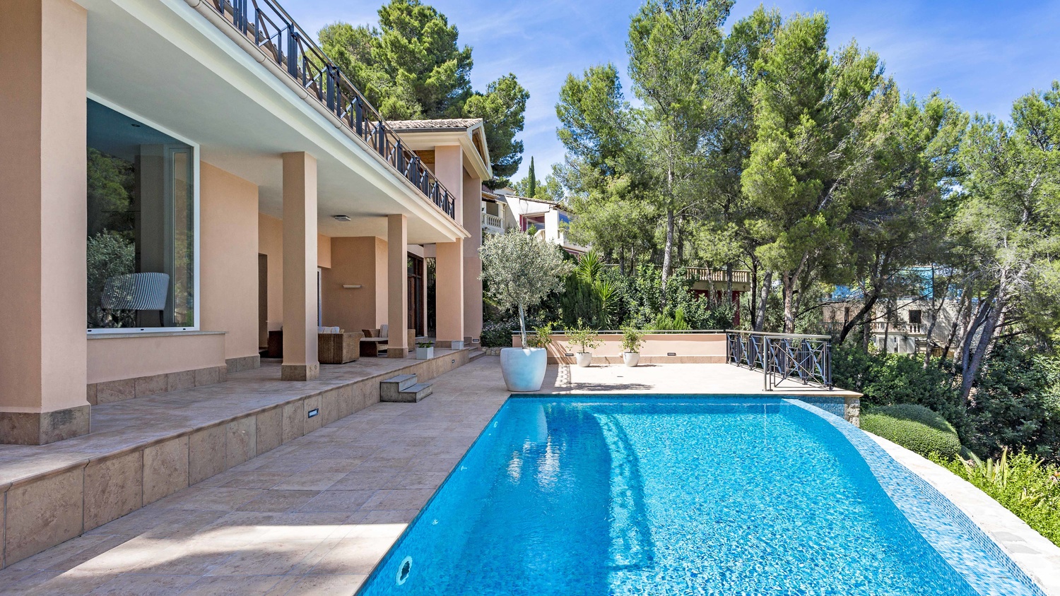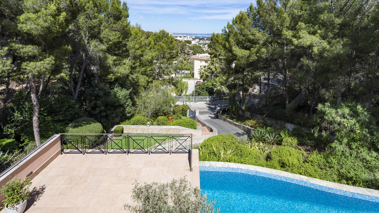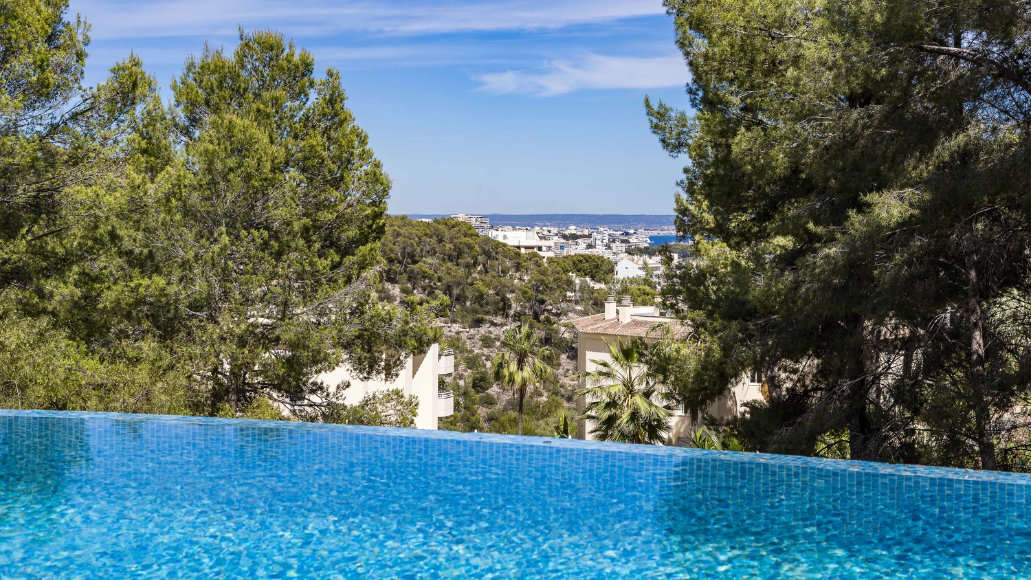 Inviting open and covered terraces, green driveway, infinity pool. Very quiet and sought-after residential area. 10 minutes from Palma and exclusive yacht harbour Portals. High privacy and views over the sea and the bay.