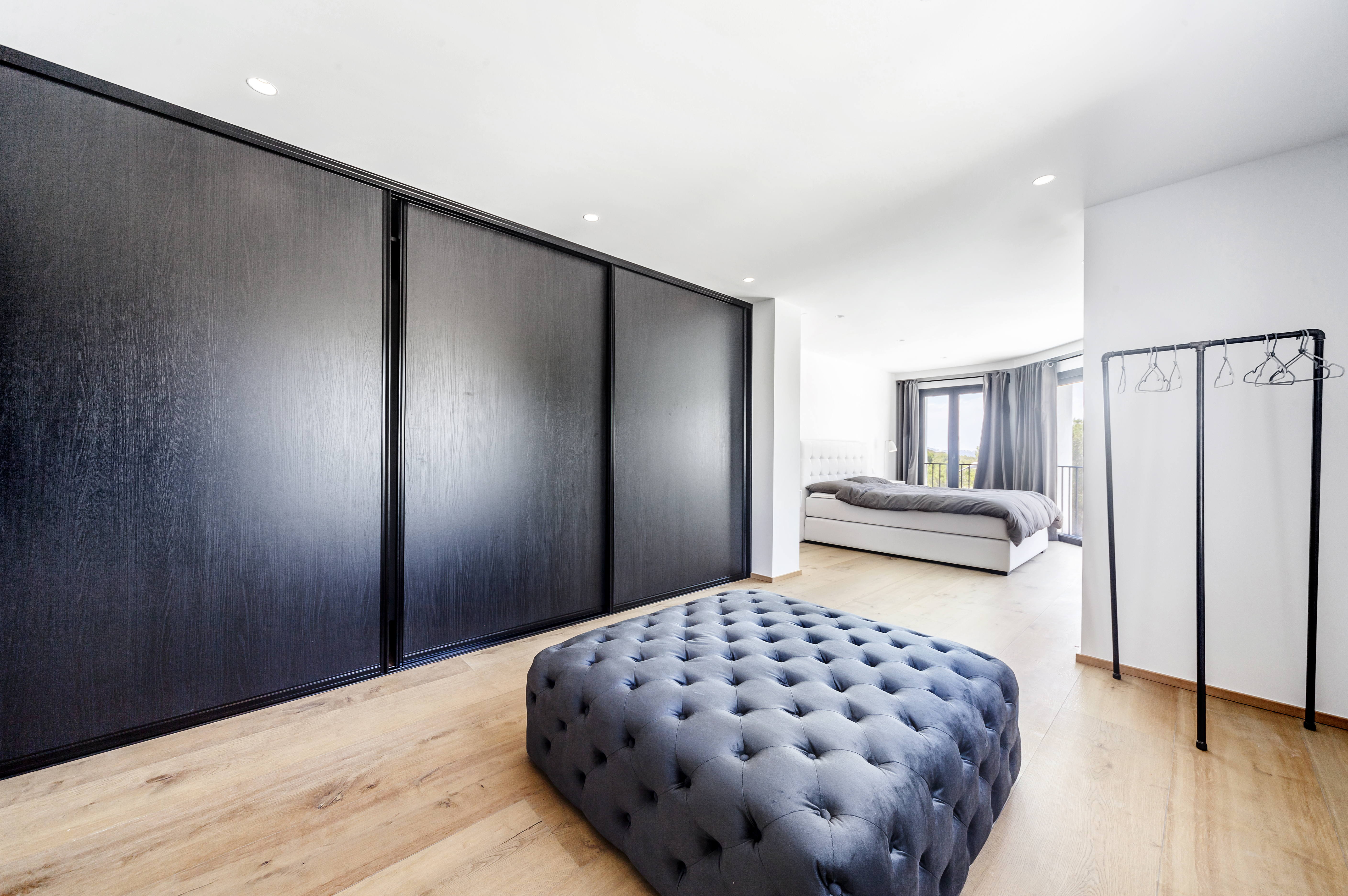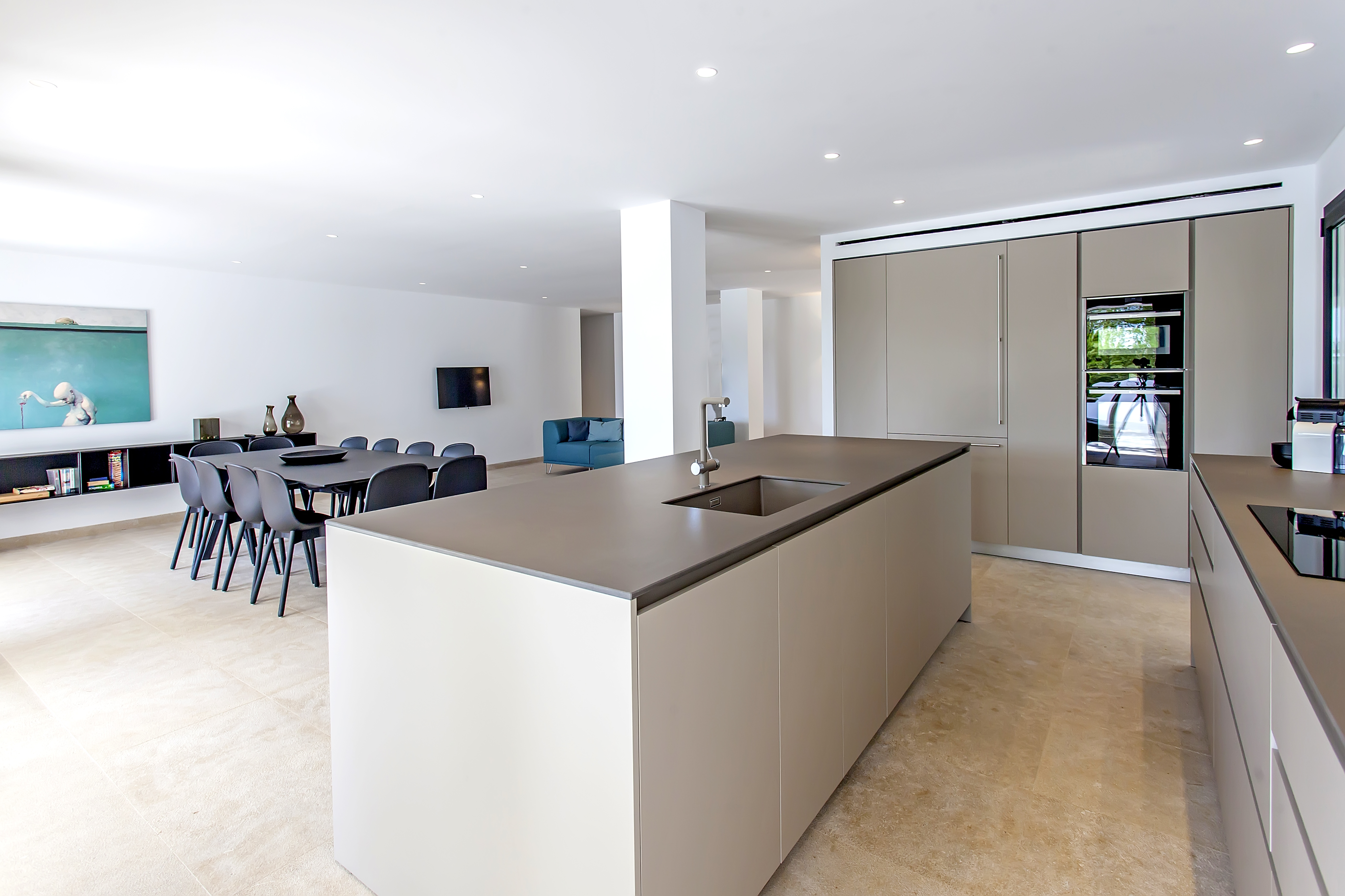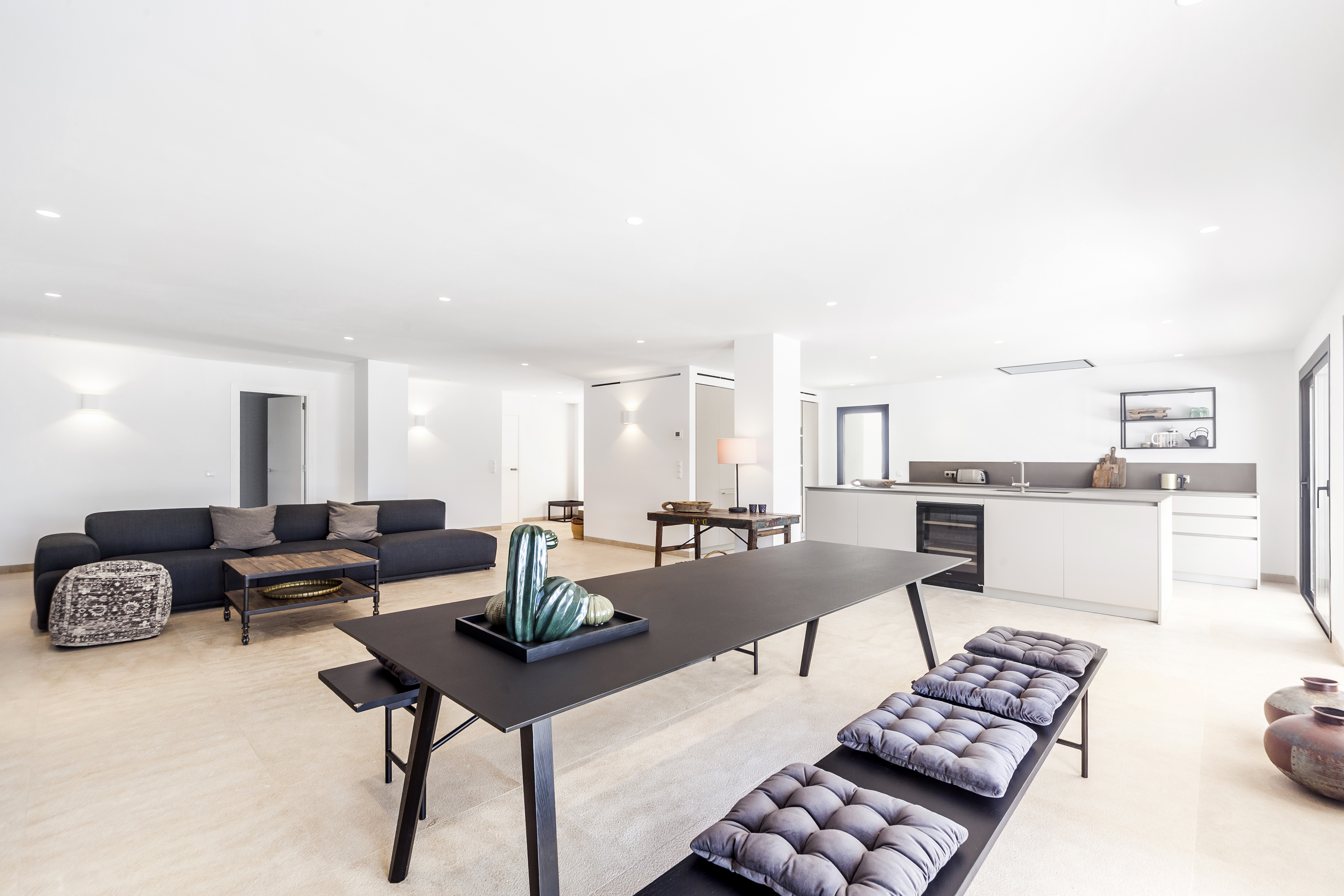 The property itself offers a lot of space with its 436 m2. On the ground floor there is a spacious lounge area, as well as open plan modern & minimal designer kitchen with appliances from Miele. The lounge opens towards a terrace, which has access to the pool and a further terrace. Further, on the ground floor you have three spacious bedrooms with their en-suite bathrooms. All very bright and light. Next to the entry door you have a guest toilet.