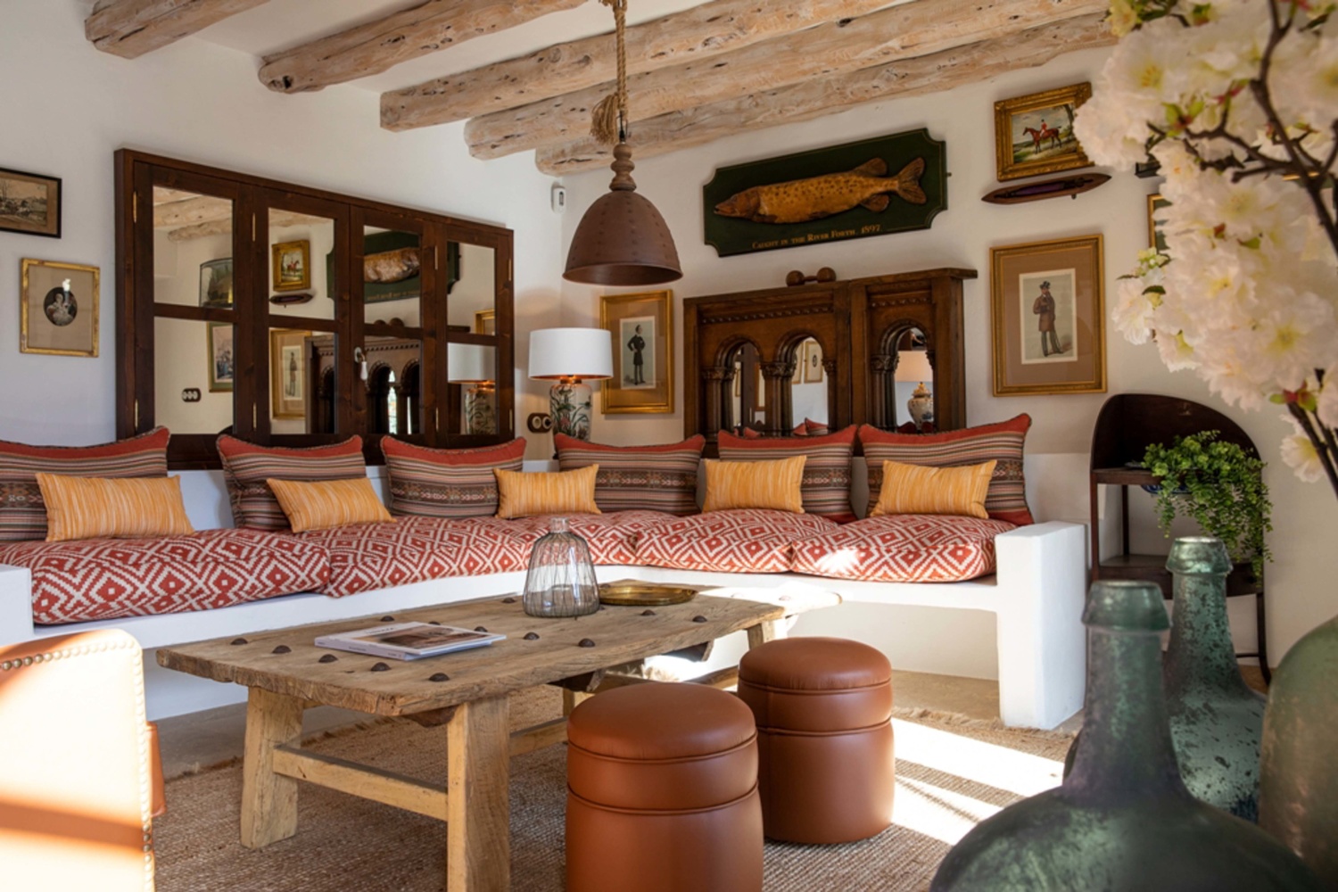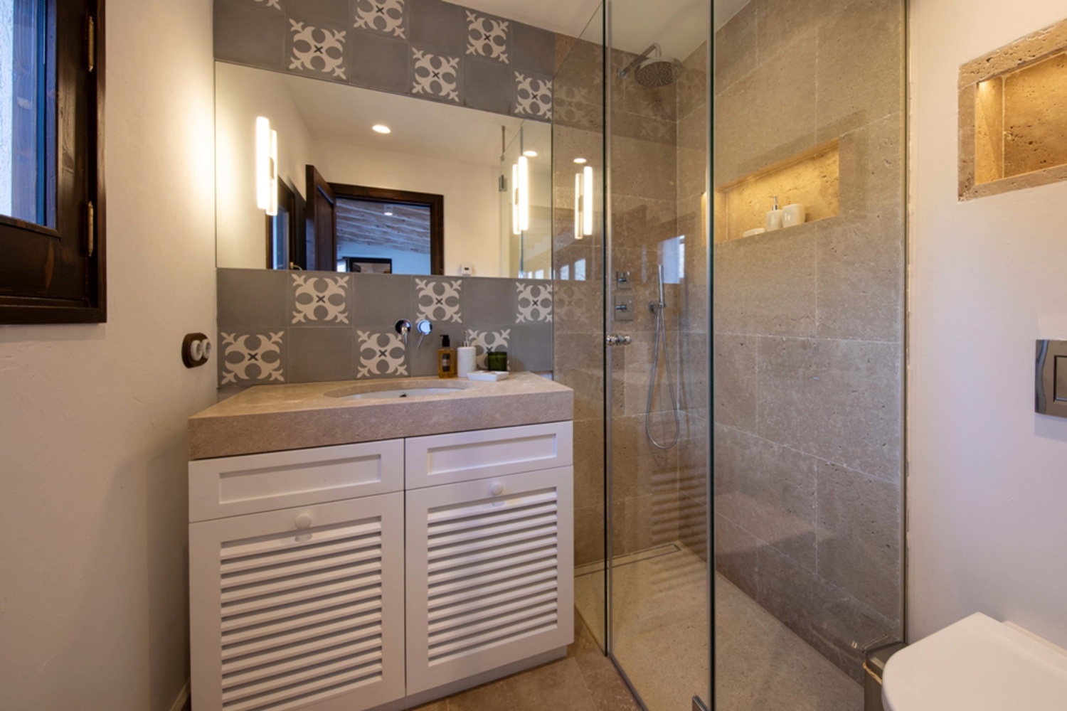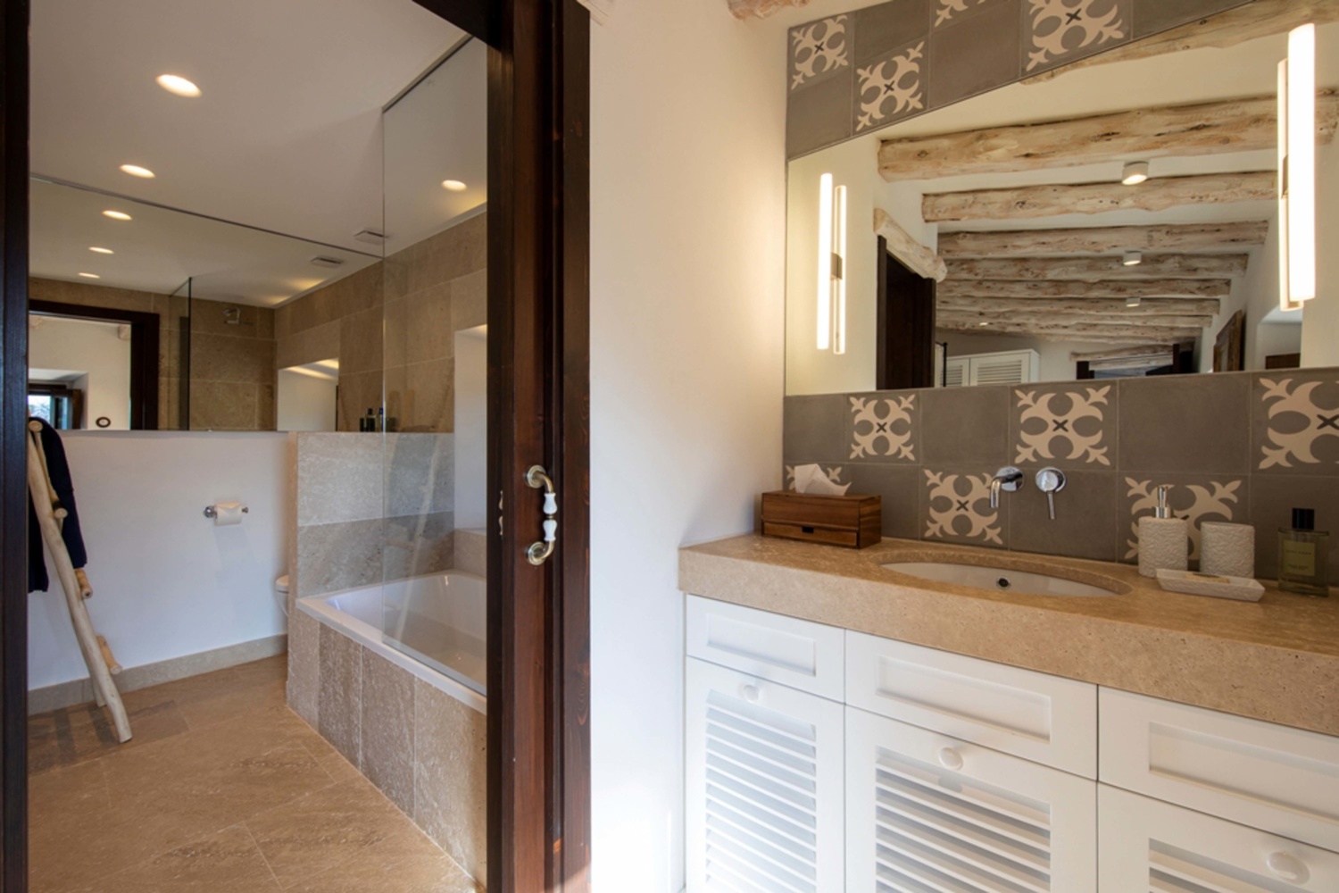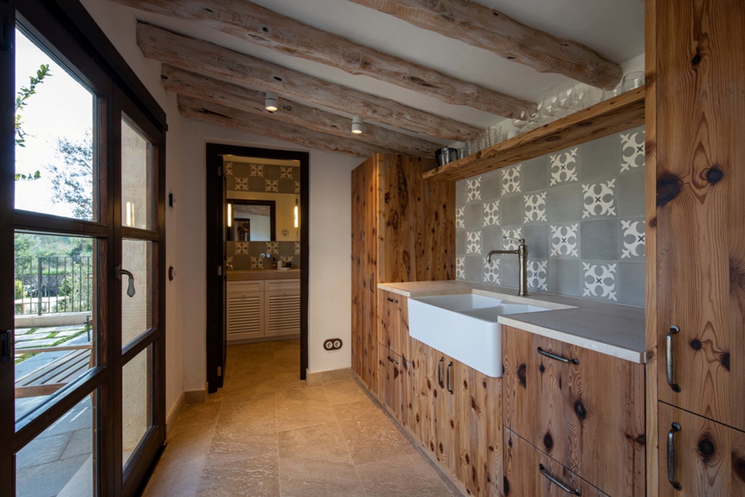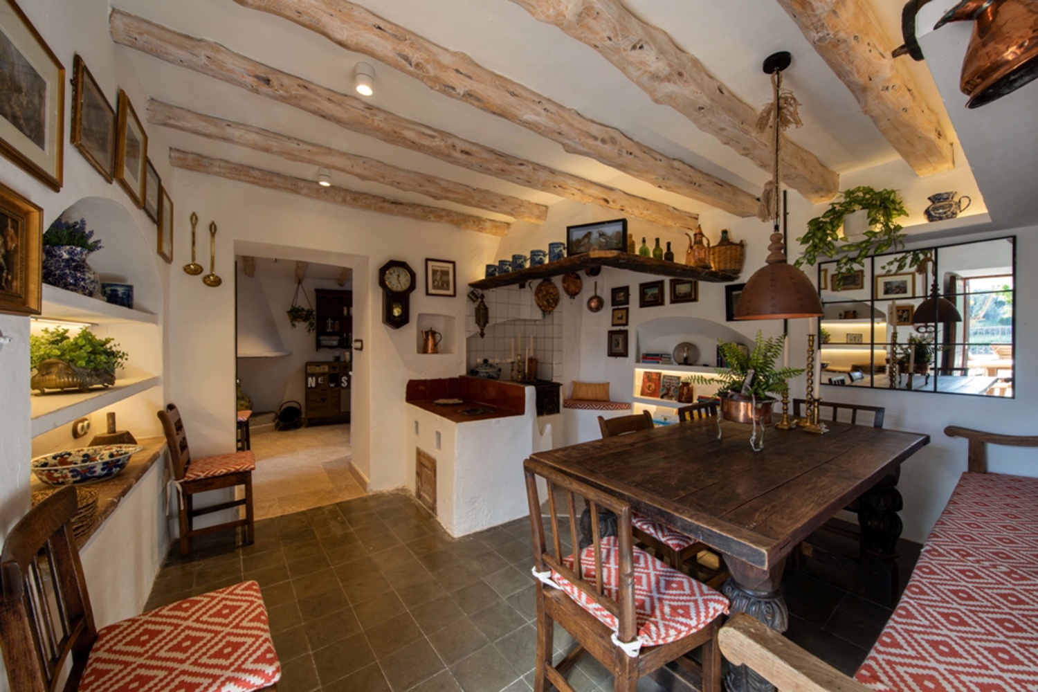 Ground Floor: hall, open living/dining area, traditional Mallorcan kitchen converted into a dining area, new separate kitchen with skylight and a guest bedroom with en-suite bathroom.