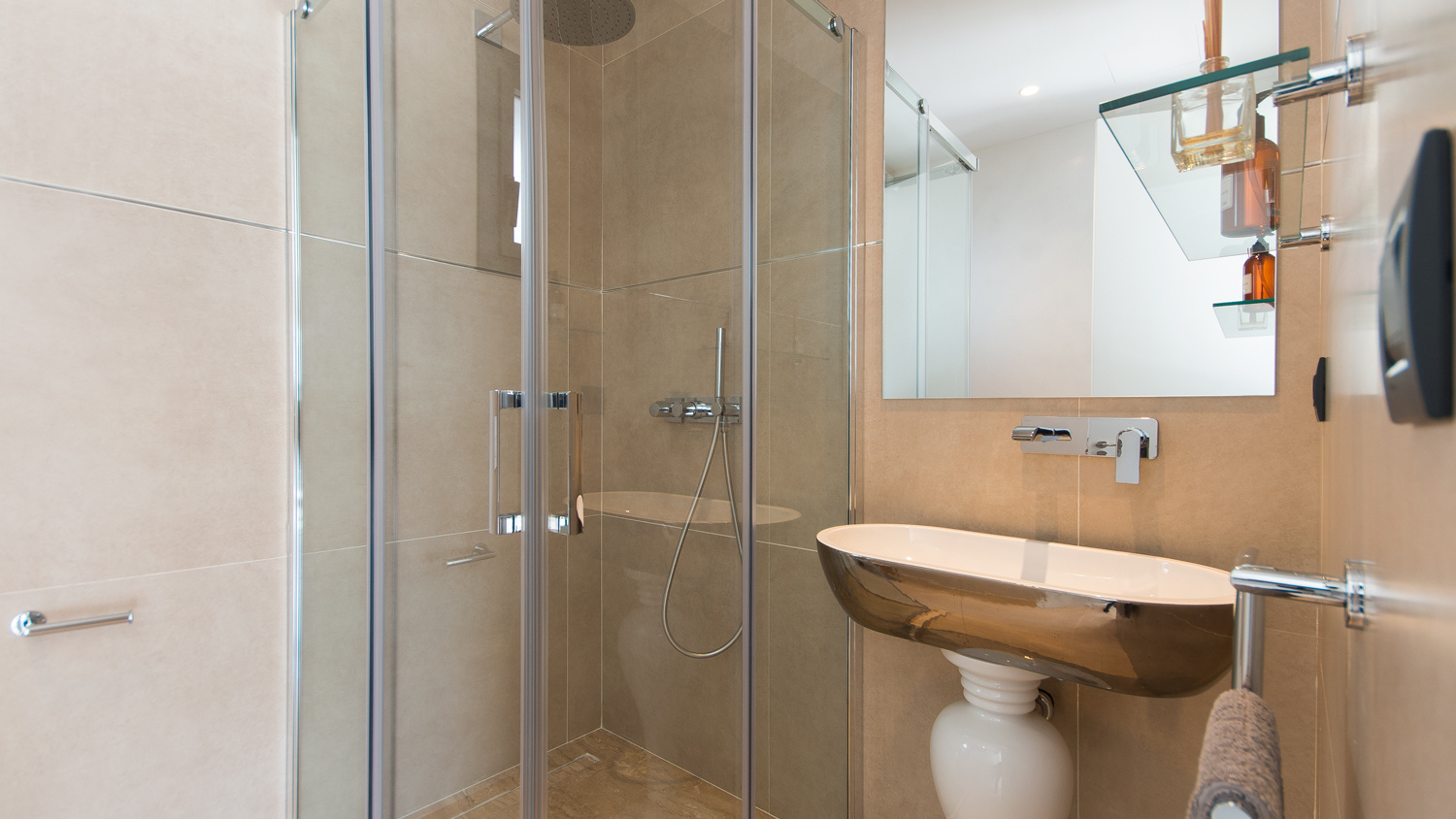 As you enter the property on the ground level, in the entrance hall there is an open room with dining area which opens out to the terrace. A fully equipped American style kitchen which can be closed off with sliding doors fitted with Miele appliances. On the ground floor, there is also a spacious double bedroom and a guest cloak room.
