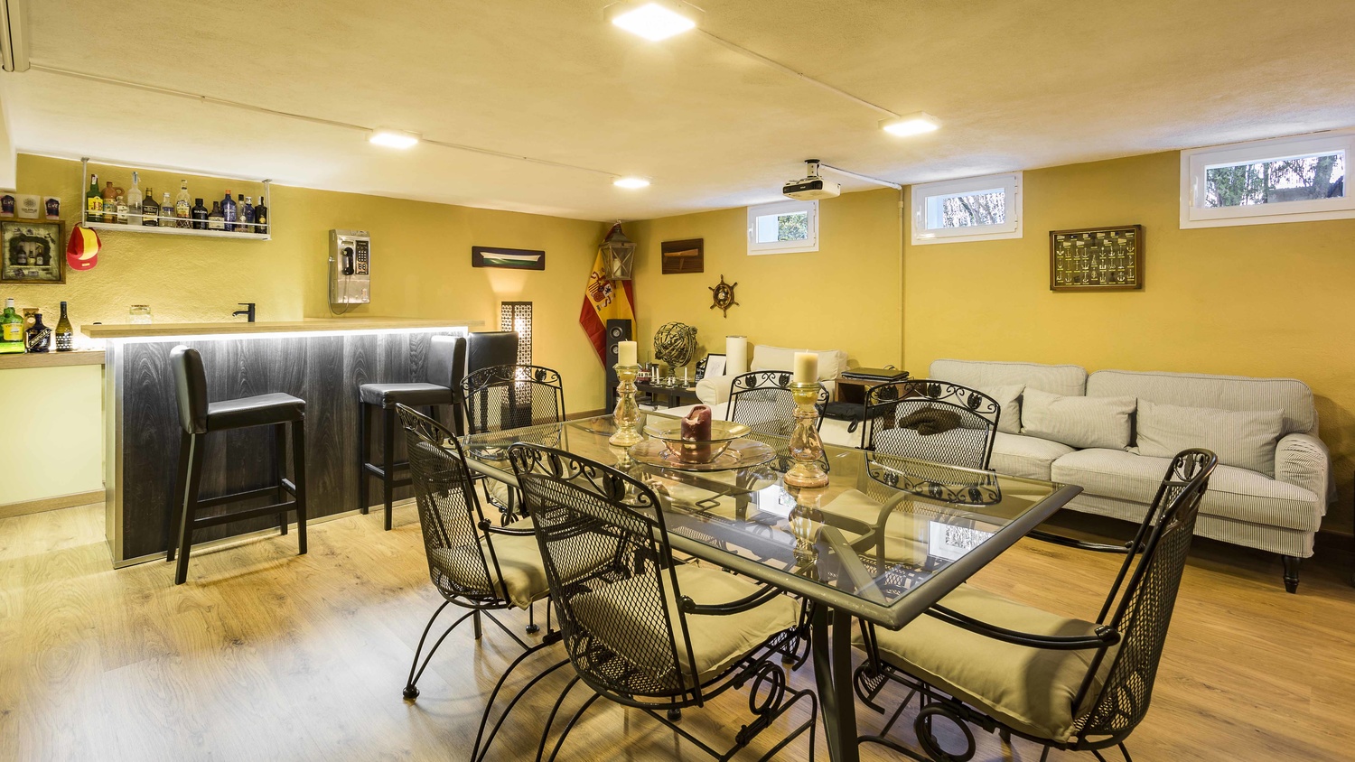Basement: garage for up to 3 cars, storage room, bar/pub and another room for Gym.