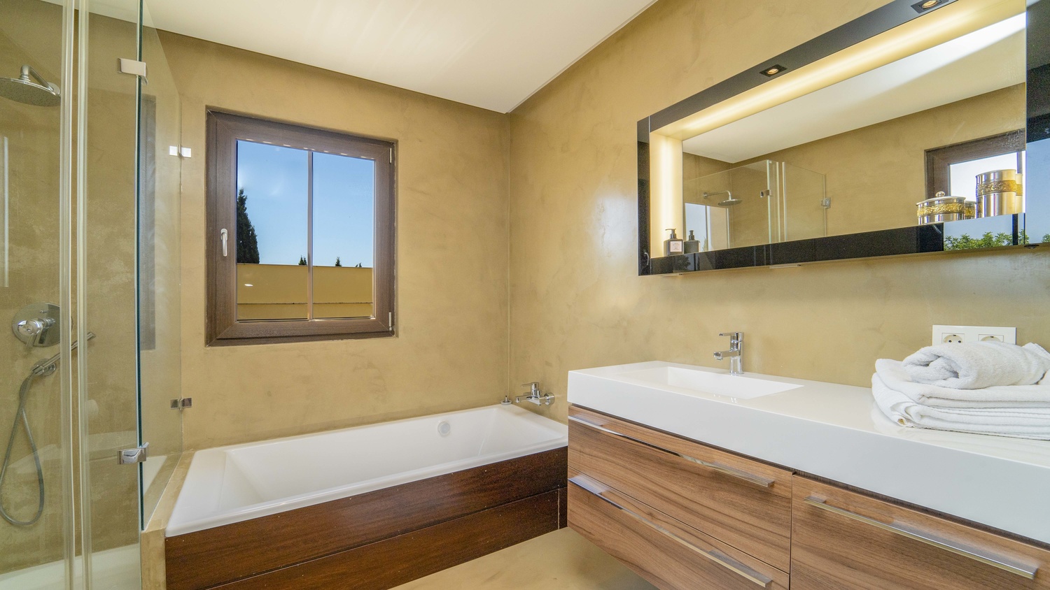 Entrance area, light flooded living and dining area with fireplace, fully equipped kitchen with breakfast terrace. Master bedroom with bathroom en suite, 3 bedrooms with bathrooms en suite, guest toilet.