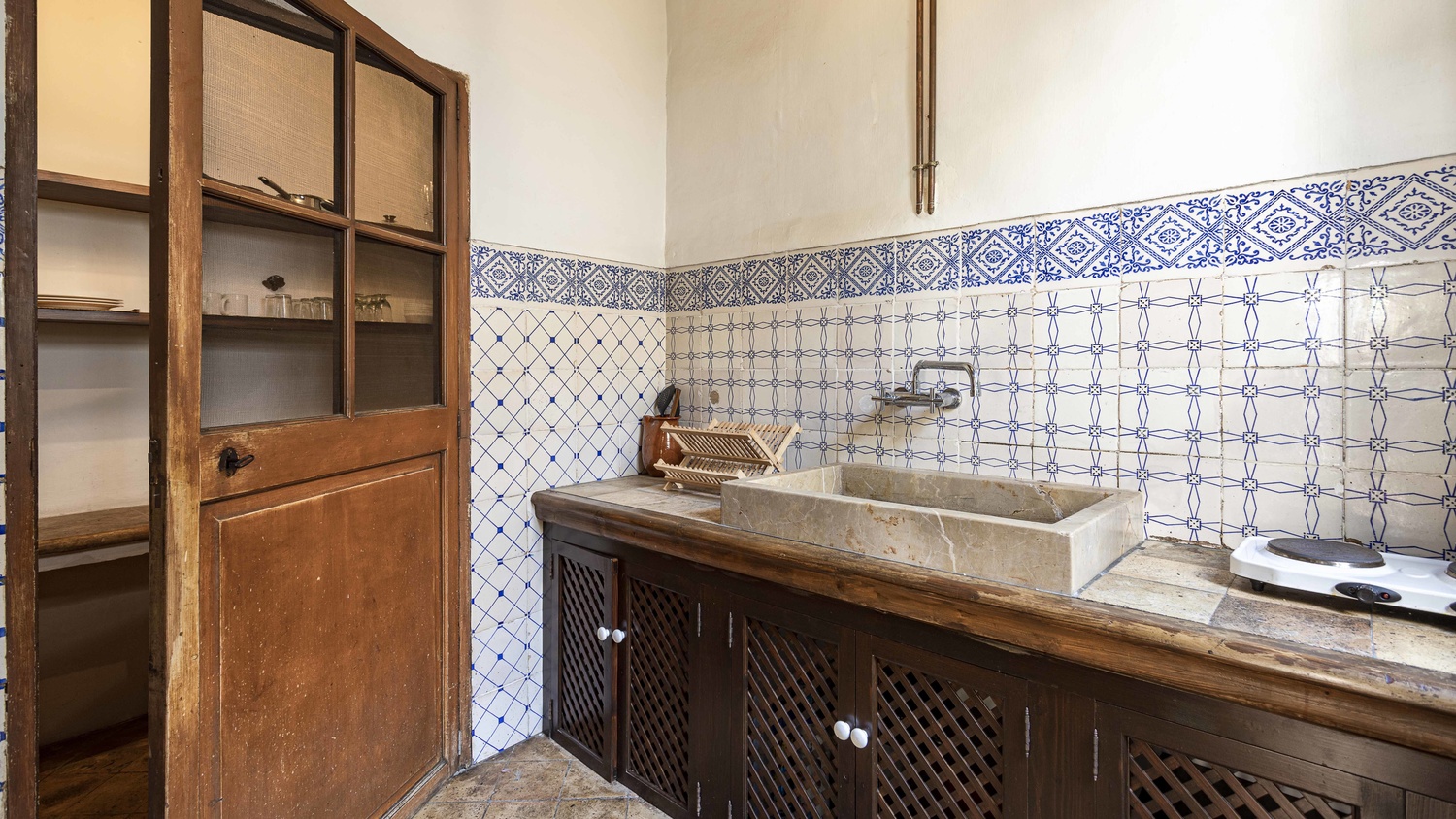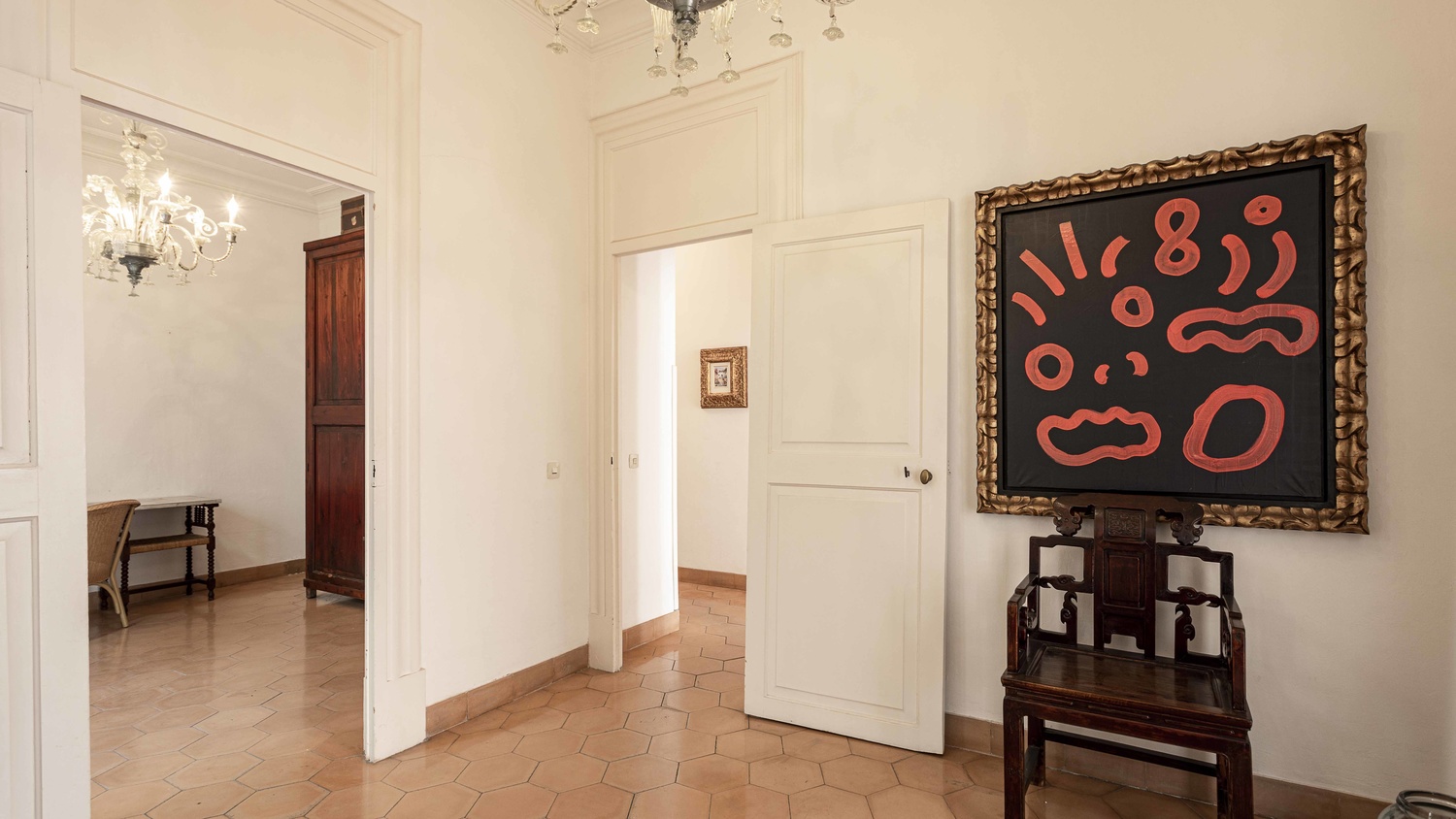 On the second floor of the building entering the front door, you are greeted with a spacious entrance hall which leads to a bright living-dining area with fireplace, double-height ceiling, and old architectural elements. On this floor, you also find 2 large bedrooms with dressing rooms, 1 and a half bathrooms, separate laundry area and in the kitchen, there is a charming spiral staircase that leads up to the loft-studio on the third floor.