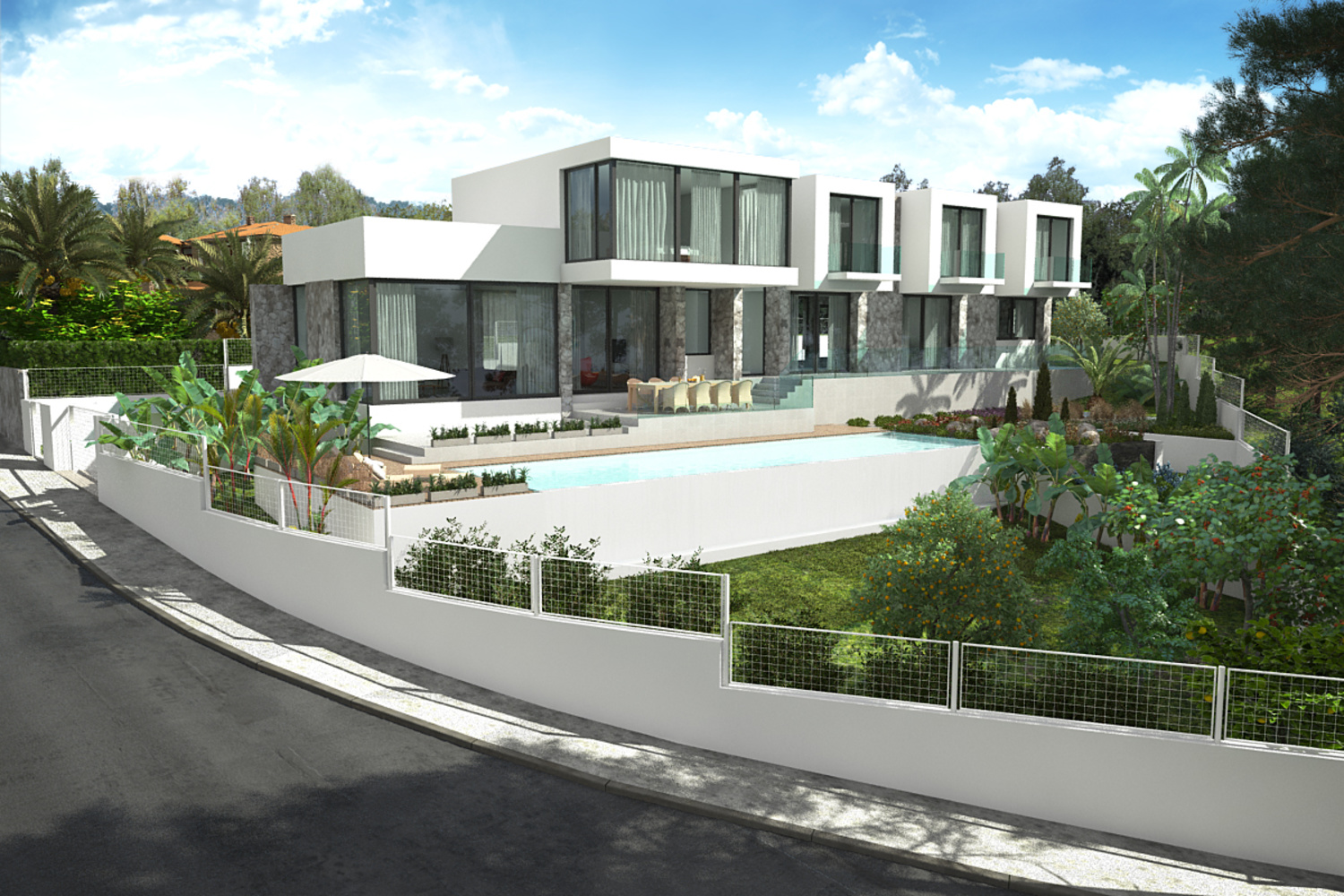The project envisages four double bedrooms, each with en-suite bathrooms and built-in wardrobes. A pool of 10 m x 5 m and a garage with automatic garage door are planned. In addition, the air conditioning and underfloor heating are installed and you can find a beautiful open kitchen with Siemens appliances as well as LED lighting in an open living area. The garden is beautifully and lushly planted in a Mediterranean style and is easy to maintain. The photos are an example of what the finished villa can look like. The buyer can choose the design himself and determine the completion accordingly.