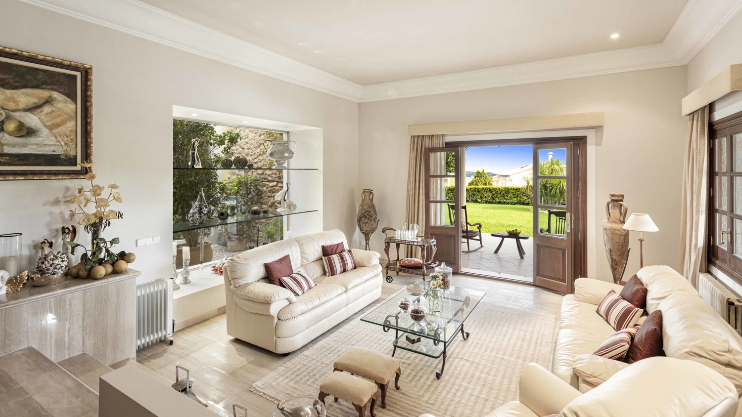 The large entrance hall leads to a spacious living room with fireplace and a large kitchen with dining area. Further, you find a pantry and two double bedrooms which share a bathroom. From the living area you access a beautiful landscaped Mediterranean garden and pool area from where you can enjoy a wonderful unobstructed view.