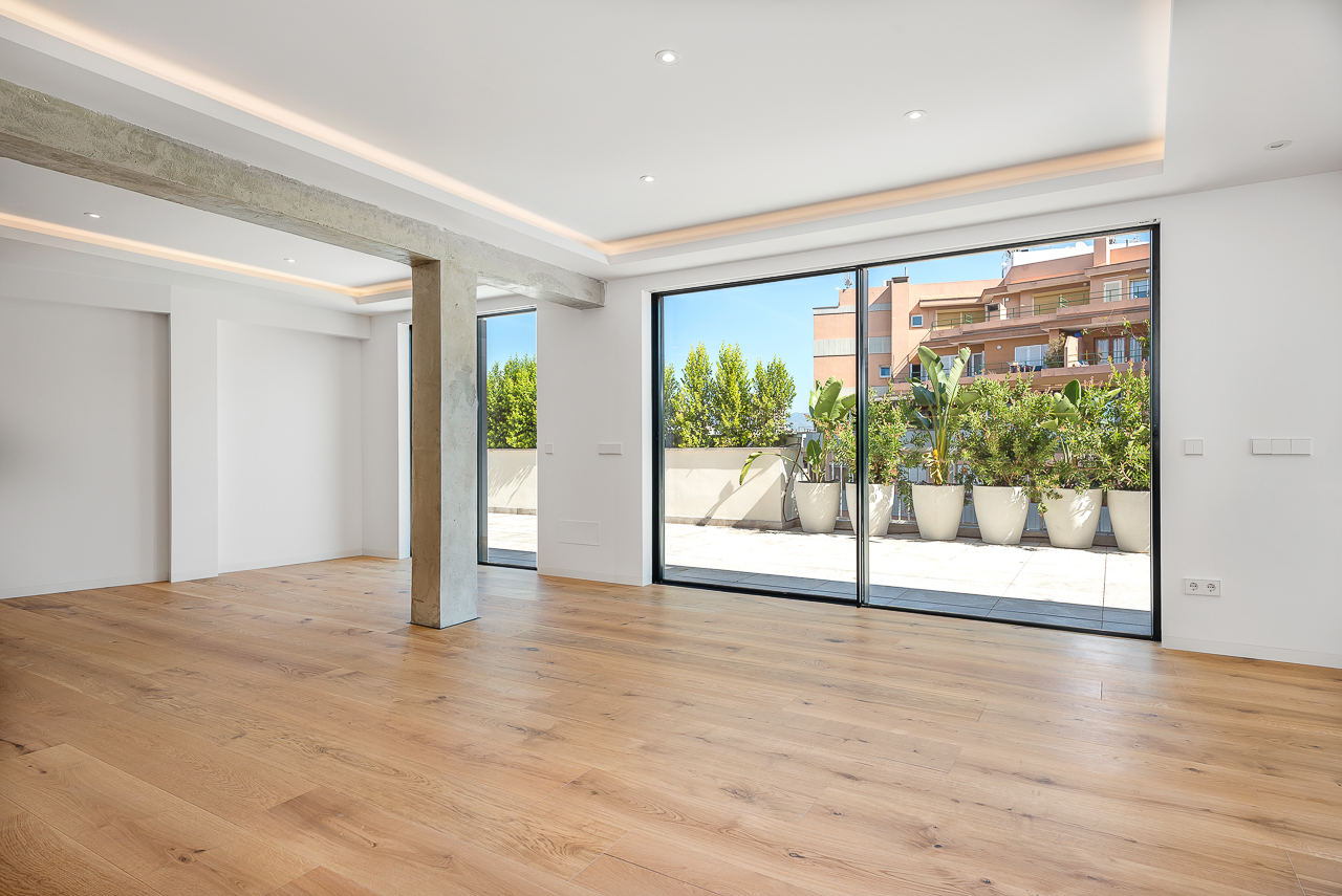 This refined 10th floor penthouse has a net living area of 170 m2 plus 110 m2 of terraces and parking. It is conveniently located in the heart of the city, just steps away from emblematic streets such as Jaime III, Paseo del Borne and the popular culinary hotspot of Santa Catalina.