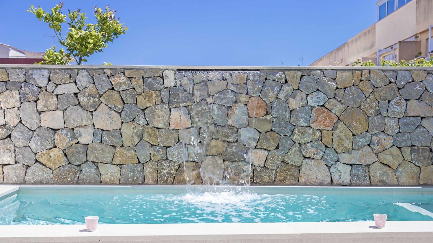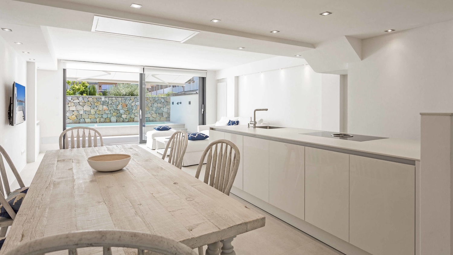 Ground floor: this property has a bright and spacious living dining area with a modern open plan kitchen. From the living area you can access directly a cozy summer terrace with pool and waterfall (including illumination).
