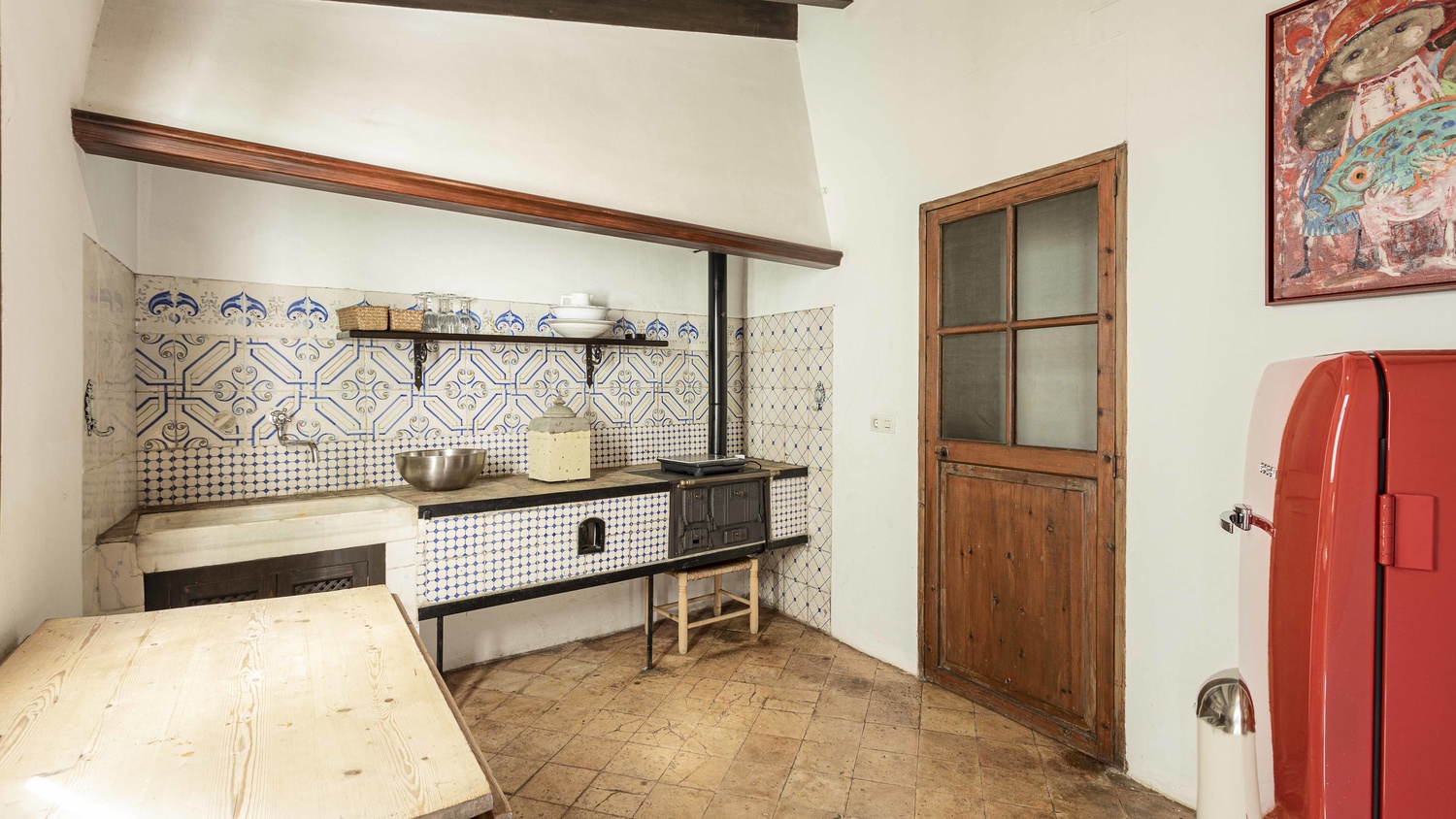On the second floor of the building entering the front door, you are greeted with a spacious entrance hall which leads to a bright living-dining area with fireplace, double-height ceiling and old architectural elements. On this floor, you also find 2 large bedrooms with dressing rooms, 1 and a half bathrooms, separate laundry area and in the kitchen, there is a charming spiral staircase that leads up to the loft-studio on the third floor.