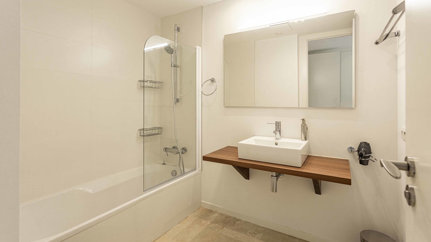 Residential floor: entrance hall, living/dining area leading out to large covered terrace, kitchen, laundry room, guest toilet, master bedroom with bathroom en-suite plus one further bedroom with bathroom en suite.